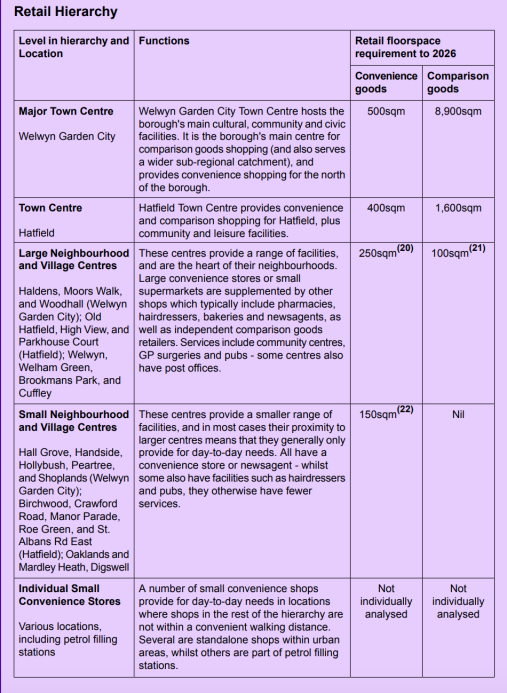 The Council will support the provision of additional retail floorspace to meet forecast expenditure growth to at least 2033 in the defined retail centre hierarchy to deliver the functions set out in the table below. Priority will be given to the provision of additional comparison floorspace in Hatfield and Welwyn Garden City town centres.